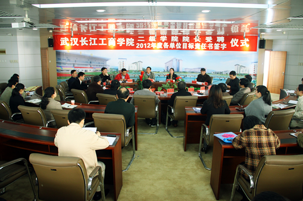 新闻中心讯(记者 王茂莲 徐玥)4月6日上午,我校二级学院院长受聘仪式暨2012年度各单位目标责任书签订仪式在第一会议室举行。6名博士生导师、教授受聘各二级学院院长,并与校长张金隆教授签订二级学院目标责任书。 我校董事长彭秀春、校领导张金隆、杨进美、邹继康、陶梅生、左宗文、颜海、张俊出席仪式。大会由校党委常务副书记邹继康主持。 二级学院院长受聘仪式首先举行。邹继康副书记首先宣读了《关于张兆国等同志的聘任通知》(长江工商董〔2012〕1号文件):聘任张金海同志为我校传播与设计学院院长,聘任张兆国同志为我校管理学院院长,聘任卢炎生同志为我校工学院院长,聘任童光荣同志为我校经济与商务外语学院院长,聘任张庆麟同志为我校政法学院院长,聘任程虹同志为我校电子商务学院院长。 校长张金隆教授向6位院长颁发了聘书,并与他们郑重地签订了2012年度二级学院各项工作目标责任书。 随后,董事长彭秀春对6位院长的就任表示祝贺,她说,6位院长都是各个领域的资深专家,有着丰富的教学、科研、管理经验,必将对各学院的学科、专业建设乃至学院的发展起到积极的推动作用。 副校长陶梅生还发表了“关于应用型人才培养思路”的讲话。他结合学校应用型人才培养的实际情况,提出我校培养应用型人才的目标应是“宽基础、强能力、高素质、能创新”的复合型人才。对于如何培养应用型人才,他提出要更新培养概念,培养目标要与市场需要紧密结合,学制安排和专业设置要合理,确立“行业引导专业、专业服务行业、行业促进就业”的理念,开办“人无我有、人有我优”的特色专业,要改革人才培养方案,重视学生综合素质的培养,加强学生创新创业实践,实现开门办学、开放办学。 最后,张金隆校长做重要讲话。他说,中国的民办教育兴起10多年,目前正处于转折期,我校未来应该怎样发展,应用型的人才应该怎样培养,主要还得依靠各位院长、同仁出谋划策,共担大任。各位院长签订了目标责任书,要力争把各项指标加满,把各项工作做实,要向广大的学生负责。此外,张校长还对学校的教学、科研、师资队伍建设、后勤服务等工作做了具体的要求。图为会议现场 摄影:张金华