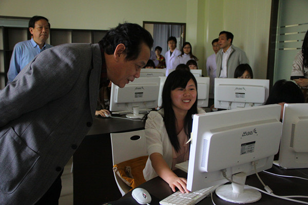 专家与正在电子商务实验室上课的学生亲切交谈