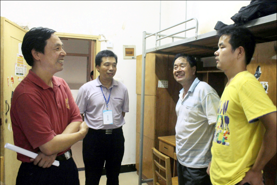 图为校长张金隆在寝室慰问新生及家长