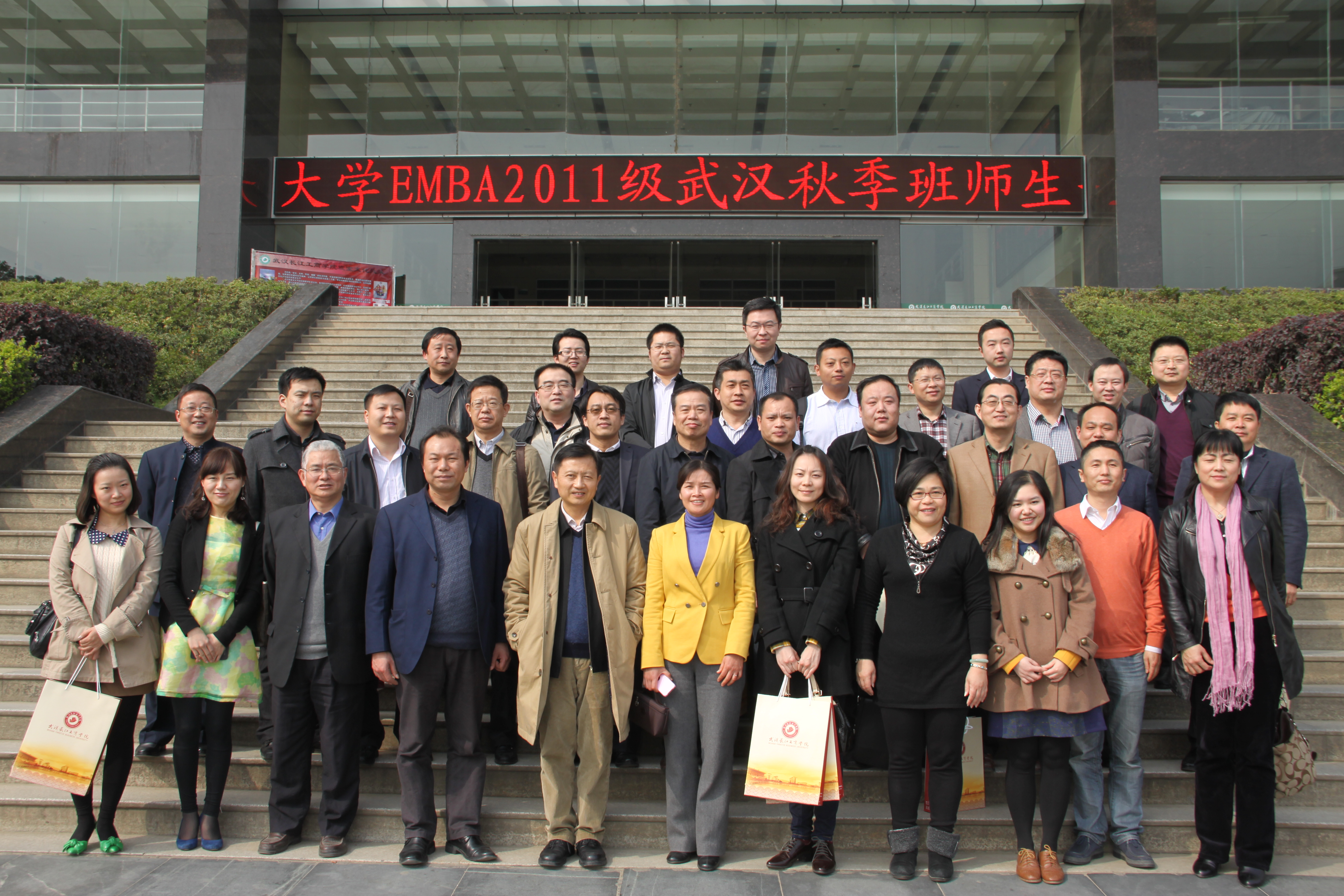 图为我校领导与华中科技大学EMBA2011级师生合影 摄影:王婷
