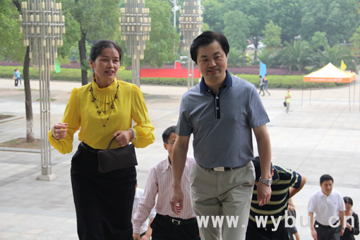 图为校董事长彭秀春与汉口银行董事长陈新民参观学校 摄影:胡乐