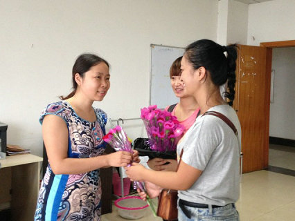 图为校社联的同学们给国际交流处的马冬玲老师献上一朵鲜花。