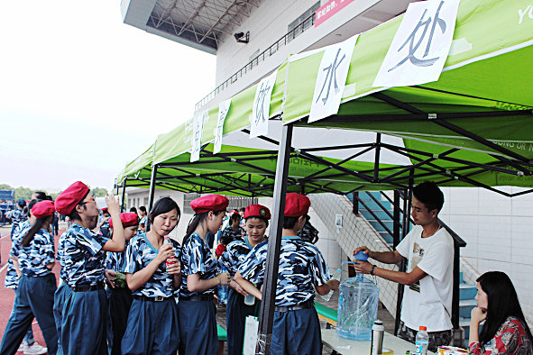 记者在田径场看到,尽管天气炎热,新生们个个精神饱满,在教官的指令下认真训练。在操场旁边,校学生会、校社联的同学们搭起了帐篷,为参加军训的新生们免费提供饮用水。