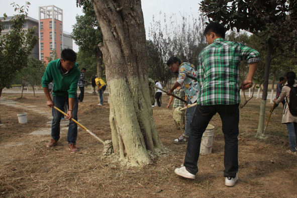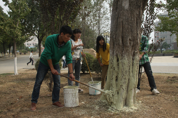 为了保质保量完成刷树工作,校青年志愿者协会特意邀请校绿化环卫中心的工作人员对此次活动进行培训指导。刷树过程中,志愿者们发扬不怕脏,不怕累的精神,不分脏活、累活,争着干、抢着干,截止到18日下午4时,校园里300棵树都穿上了“新衣”。