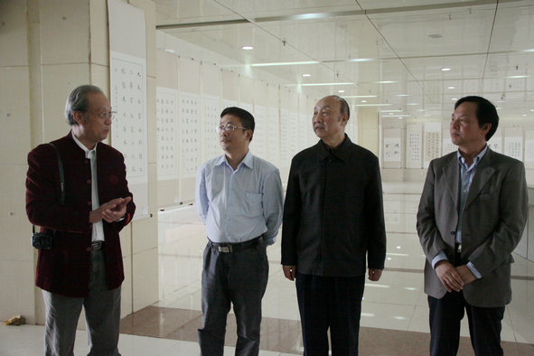 图为我校校长张金隆,副校长陶梅生,校长助理左宗文,书法班指导老师参观迎新书法作品展 摄影:孔贵骑