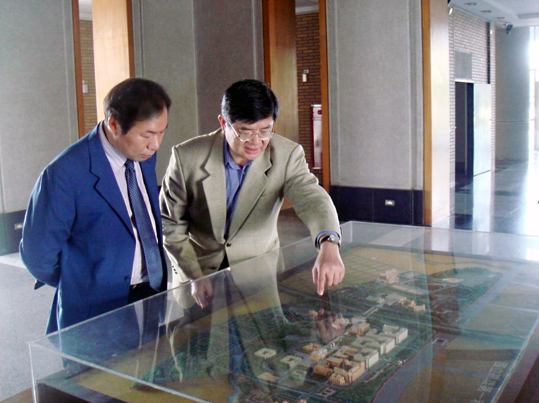 图为台湾高雄第一科技大学林楚雄教授向陈伟书记介绍学校校园建设 摄影:张洋