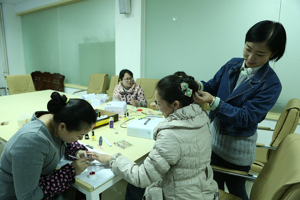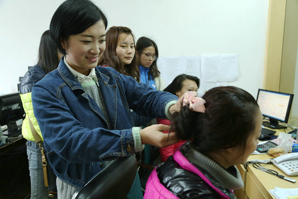 图为学生用亲手做的发饰给老师们盘头发 摄影:郑佳佳