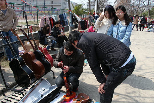 图为学生在跳蚤市场卖吉他 摄影:林典