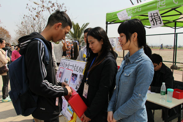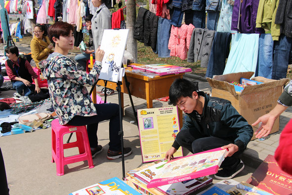 图为同学们在跳蚤市场做爱心义卖 摄影:林典