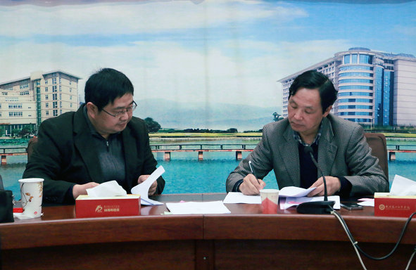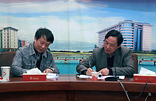 图为张金隆校长与艺术与设计学院顾问许开强签订2014年度工作目标管理任务书 摄影:林倩