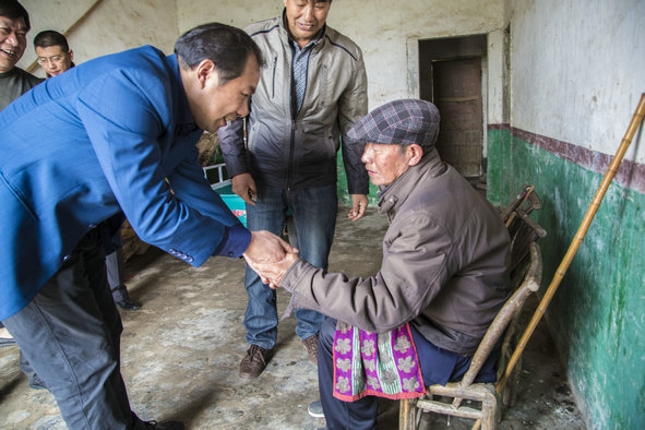 图为陈伟书记嘱咐彭生荣老人照顾好身体 摄影:蓝静