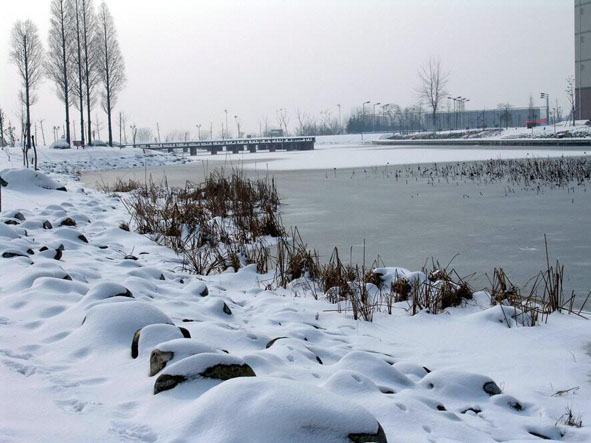 冬日,黄家湖水结成冰,白雪皑皑,银装素裹,整个校园变成了一个晶莹洁白的世界。