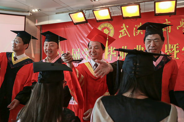 图为学位评定委员会委员为毕业生授予学位、扶正流苏 摄影:李鳌