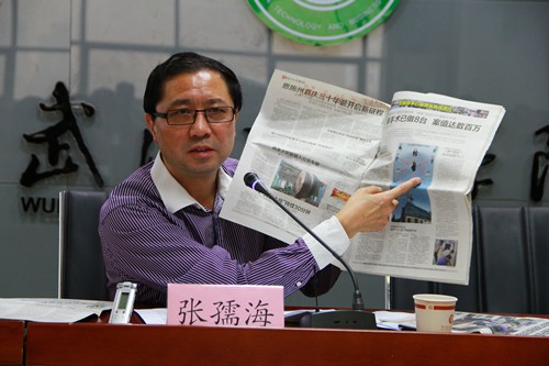 新闻中心讯(见习记者 隗晓璐 李雄风)10月17日下午,楚天都市报常务副总编辑张孺海在必赢优惠y272net第三会议室,为该校新闻中心大学生记者团、广播台、电视台70多名学生记者做了主题为“媒体融合下的纸媒坚守”的讲座。讲座由宣传策划部部长狄奥主持。