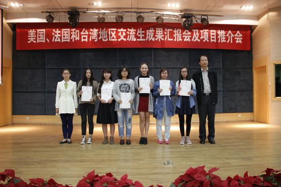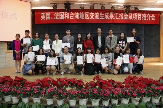 刘腾红副校长宣读了《关于奖励赴台优秀交流生的决定》,为所有赴法、赴美、赴中国台湾地区交流的学生们颁发了对方合作学校和机构的交流证书,并为在交流中表现优秀的学生颁奖。经外学院刘畅获得一等奖,经外学院陈淑慧与管理学院赵恺童获得二等奖,电子商务学院周晶慧、经外学院邵钰莹与经外学院赵晨羽获得三等奖,管理学院泽永吉与电子商务学院周晶慧获得优秀奖。