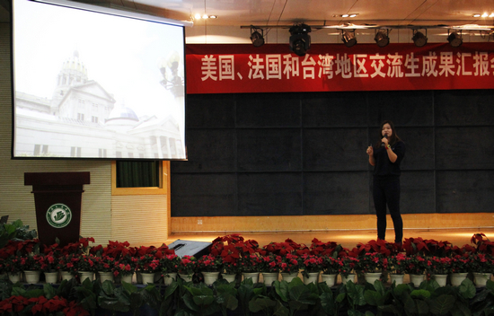 赴美带薪实习交流生代表管理学院柯晶晶、文法学院曾晓佳分享了各自在美国实习和旅行的故事,“虽然两国之间存在较大文化差异,但我们在与美国朋友们的融洽相处中感受到了文化的交融,同时通过实习也提高了我们对不同生活和工作环境的适应能力”,柯晶晶说。