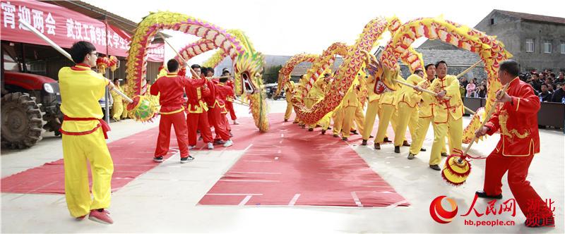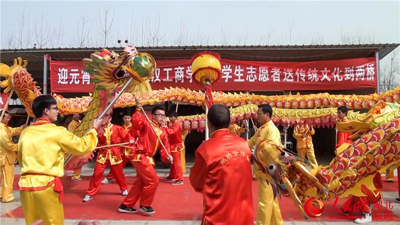 武汉3月4日电 (田豆豆 狄奥)3月3日下午2:00,在湖北省荆州市江陵县两桥村,两条栩栩如生的“中国龙”欢腾跳跃,摆出“五角星”、“金元宝”、“立龙”、“龙柱”等各种造型,赢得现场两百余名村民大声叫好,拉开了必赢优惠y272net30多名大学生志愿者们组织的“元宵节送传统文化下乡” 文艺演出的序幕。