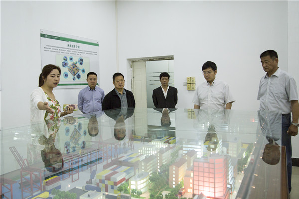 张新祥教授(右二)在夏再兴教授(左三)、张俊(左二)和颜爱国副主任(右一)的陪同下参观实验教学中心