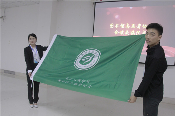 图书馆志愿者协会新任会长陈媛媛发言,她向大家介绍了协会的管理制度及未来的工作规划。大会还举行了会旗交接仪式,上任会长陈健将会旗交至现任会长陈媛媛手中,图书馆志愿者协会的换届工作也在会旗的交接中完成。
