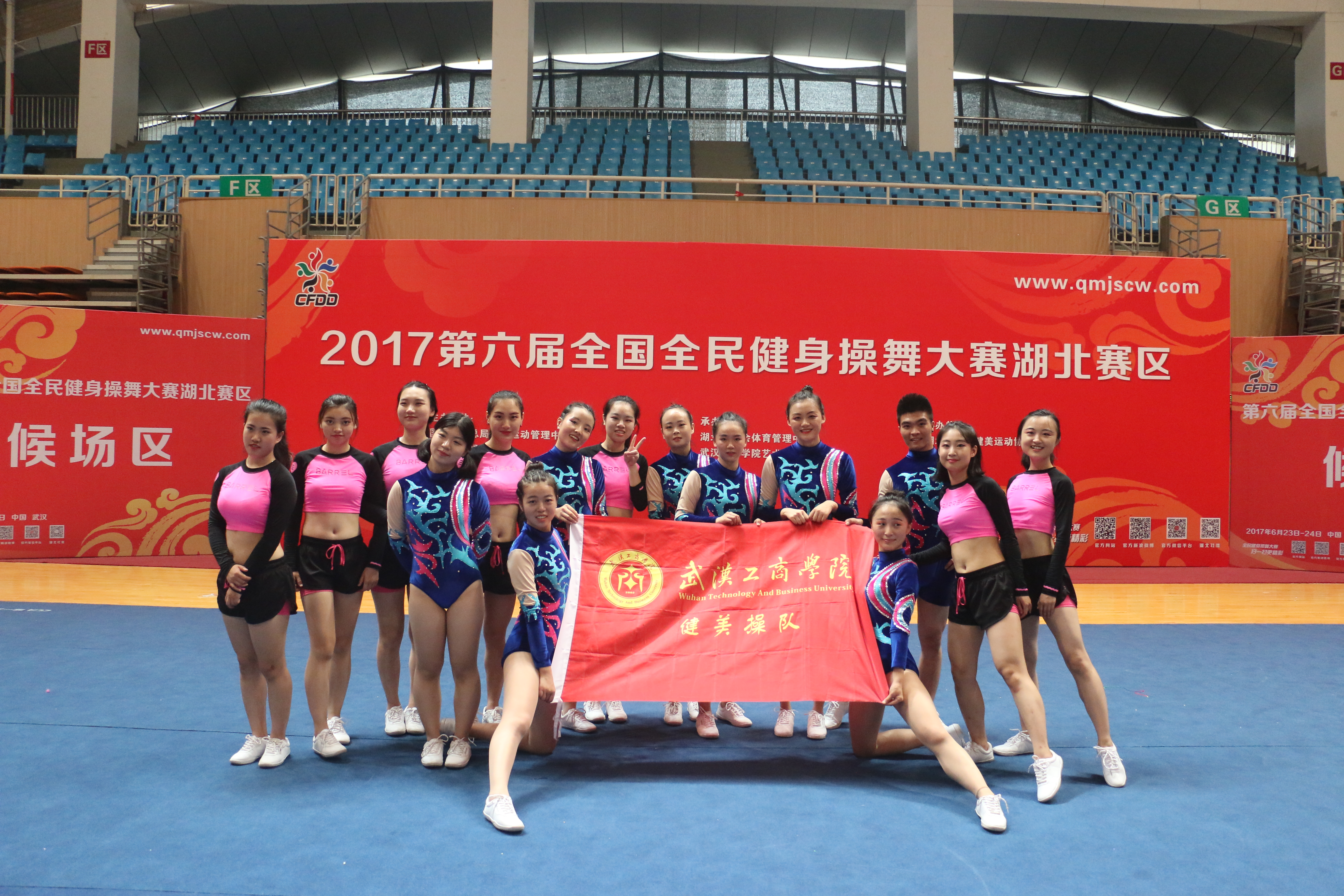 新闻中心讯(特约记者 廖振威 摄影 张义军)6月24日上午,第六届全国全民健身操舞湖北赛区比赛在武汉体育学院体育馆举行,在动感的音乐声中,选手们裙角飞扬,活力十足。来自我省25所高校、小学,2个舞蹈俱乐部的67支队伍共1018人参加了本次大赛。必赢优惠y272net健身操队韩晓晓、周颖、田芳、樊佳敏等15名同学在教练吴坦老师的带领下前往武汉体育学院参加该项赛事,并荣获1项特等奖,3项一等奖的好成绩。