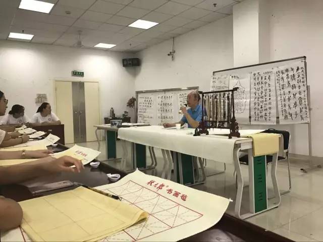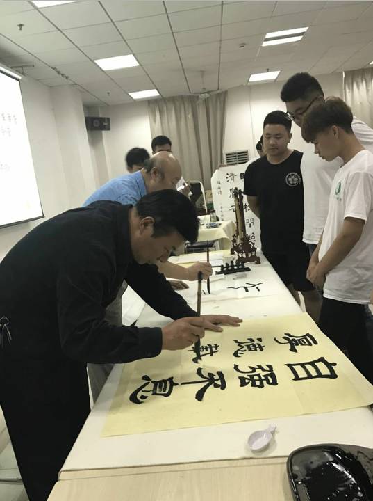 《大学》有云:“知止而后有定,定而后能静,静而后能安,安而后能虑,虑而后能得。”练习书法,既可以提高定力,还能修身养德。下午,该校特聘顾问陶梅生教授带领学员们进行了一场中国传统书法的学习体验之旅。他首先介绍了我国传统书法的悠久历史,并以自己书法作品为例,向学员们讲解了甲骨文、金文、隶书、楷书、行书和草书等不同书法的风格、特点与写作方法。学员们纷纷对传统书法产生浓厚兴趣之后,陶梅生教授从毛笔的执笔法以及“横”、“竖”、“撇”等汉字笔画着手,带领大家一字一画的写起来。