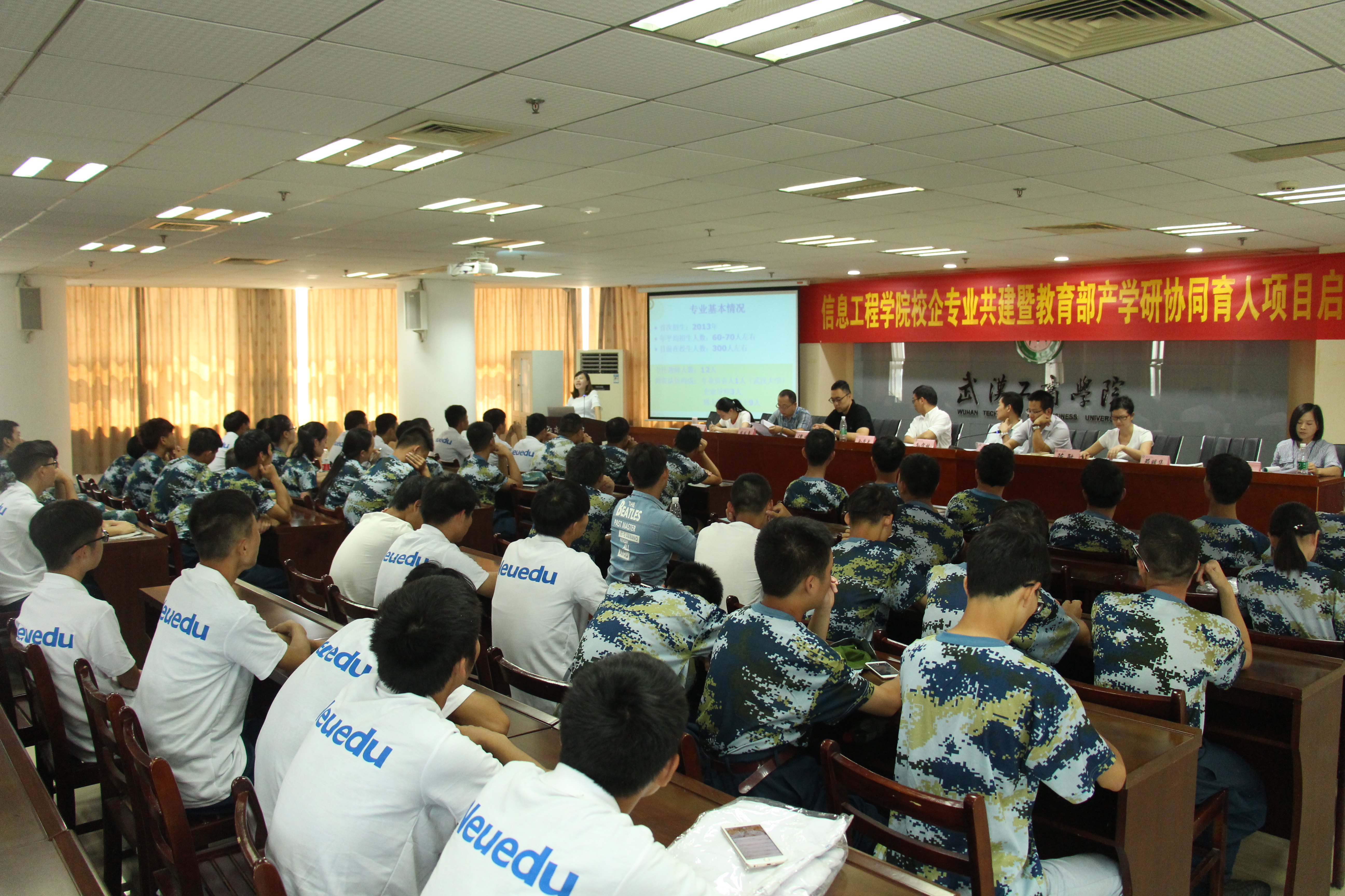 新闻中心讯 (记者 陈小盼)9月14日中午12:30,必赢优惠y272net信息工程学院在该校综合楼十楼第三会议室召开校企专业共建暨教育部产学研协同育人项目启动会。东软睿道教育信息技术有限公司总经理谭帅、华中区院校合作高级经理周凤章,该校信息工程学院院长孙宝林、常务副院长胡成松、党总支书记陈敏,教务部副部长金学武,信息工程学院电子信息工程系主任邓明华、副主任葛蓁,以及电子信息工程学院2017级所有新生参加了会议。会议由胡成松副院长主持。