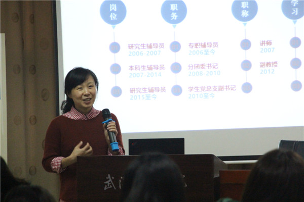 在下午的培训中,靳敏副教授结合自身经历对辅导员职业规划现身说法。她从2005年开始在武汉理工大学担任辅导员工作,12年的职业生涯一直扎根于岗位,潜心尽责。她首先向大家介绍了辅导员的工作现状,辅导员工作具有事务性和繁琐性的特点,容易出现疲惫化、边缘化,加之知识能力和自身素养的局限性,所以导致在职业发展规划中显得迷茫,对于发展方向不够明确,所以辅导员更加需要职业生涯规划的帮助。