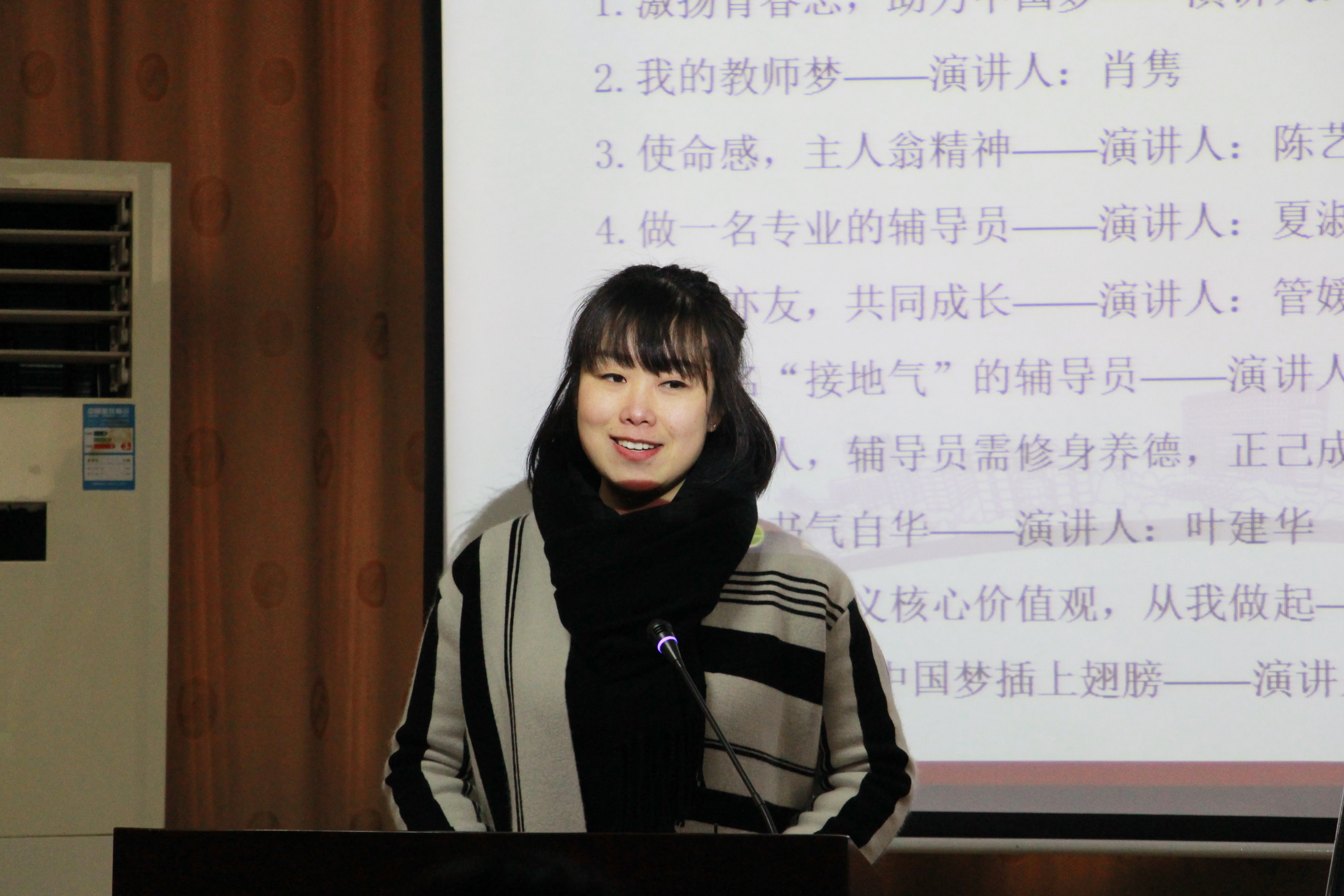 紧接着,比赛正式开始。本次比赛通过个人演讲和案例分析两个环节,全面考察了辅导员老师的综合素质和业务能力。张力老师通过精彩的演讲诠释了身为一名辅导员在教育事业中“激扬青春志,助力中国梦”的深刻内涵。在案例分析环节,他结合自己的工作实际围绕“同学之间是否存在民族歧视问题”,以毛泽东及其老师徐特立的事迹为例,阐明了辅导员应该对学生一视同仁,关爱学生,营造各民族学生和睦相处的温馨氛围的重要性。肖隽老师在个人演讲中以饱满的热情向大家展示了她对教师这份职业坚定的追求。在案例分析环节,回答如何解决学生创业和学业冲突的问题时,她说道:“我会和学生深入谈心,及时了解学生的现状和想法,并邀请相关老师指导其创业,帮助他们理清学业和创业的关系,解决实际问题。” 陈艺丹老师在谈到如何处理学生的寝室矛盾问题时说:“一是要公平公正,二是对学生进行教导谈话,三是鼓励家境不好的同学好好学习,四是要经常走访寝室关注每一个学生,以包容的心态去理解关心每一个学生。”汪燕老师表示,要立志做一名接地气的辅导员,坚持走到学生中间,走进学生心间。“立德树人,辅导员需修身养性,正己成人。”龙黎明老师认为,辅导员是学生教育过程中的组织者、实施者和指导者,同时辅导员也是学生成人成才的职业导师和知心朋友。作为辅导员,应该立德树人,成为学生们学习的榜样,做最好的自己才能教出最好的学生。候芳老师在演讲中表示,学校是筑梦追梦的地方,辅导员肩负着追梦者人生导师的重大使命。作为辅导员,应该坚持“三查一访”工作,关注学生身心健康,用情感架起师生沟通的桥梁,鼓励学生勇于追梦,为学生插上圆梦的翅膀。