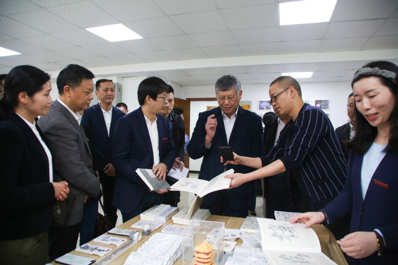 在艺术与设计学院设计工坊,学校“字绘中国”“非遗汉绣”等师生创意团队向刘新成一行展示了《字绘中国》系列创意书籍、衍生品以及非遗汉绣作品。艺术与设计学院院长王海文介绍,《字绘中国》师生团队将不同城市的标志性人文景观、建筑物等融入汉字,目前已经出版了多部书籍,并衍生出系列文创产品,这种“由作业到作品,由作品到产品,由产品到商品”的教学改革经验获得了学生和社会的高度认可,获全国插画双年展专业组优异奖、“武汉市设计行业重大创新成果”等多项大奖,这支团队还获得了500万元人民币天使轮融资。