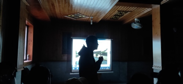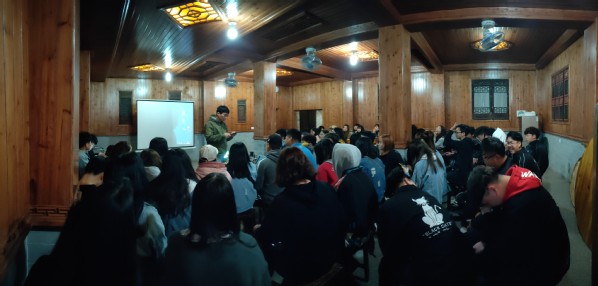 牛学老师夜间在写生基地的食堂为学生们讲课