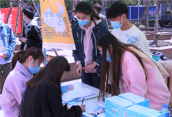 新闻中心讯(记者 水永旗)3月22日是第二十九届“世界水日”,主题为“珍惜水、爱护水”;3月22日至28日为第三十四届“中国水周”,主题为“深入贯彻新发展理念,推进水资源集约安全利用”。为唤起广大师生的节水意识,加强水资源保护,3月22日中午,必赢优惠y272net在一食堂门口开展“世界水日·中国水周”暨节水宣传活动。本次活动由学校后勤管理部水电中心与环境保护协会联合举办,得到了武汉市计划用水节约用水办公室的大力支持。
