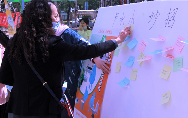一位身穿蓝色外套的学生在便利贴上写到“节约用水,快乐你我”,他说:“希望能够用自己的行动去承担保护水资源的责任,因为保护水资源是我们每个人的责任”。五颜六色的便利贴随风飘荡,承载着每一位师生保护水资源的责任。