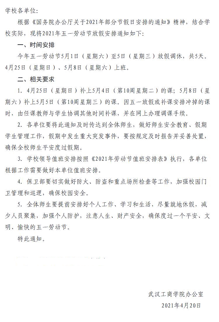 关于2021年五一劳动节放假安排的通知