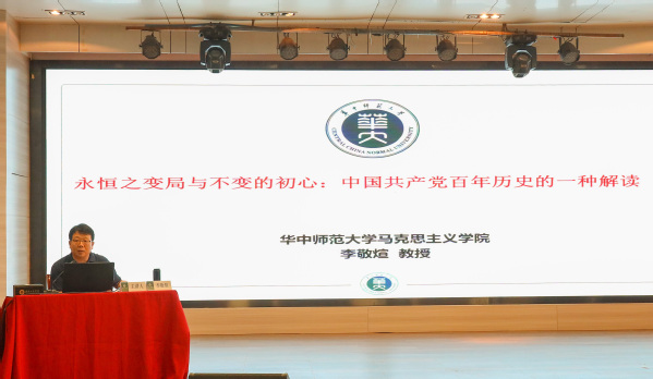 新闻中心讯(记者 陈彦芳 谢佳)“中国共产党的百年光辉历程、伟大贡献、初心宗旨、理论成果、革命精神和宝贵经验是党史学习教育活动的重点,中国共产党百年来经历了各种各样的‘变局’,但正是以为人民群众谋幸福,为中华民族谋复兴的初心,不仅积累了应对‘变局’的重要经验,而且获得了应对‘变局’的重要启示。”5月13日,党史学习教育省委宣讲团专家、华中师范大学马克思主义学院马克思主义中国化教研部主任李敬煊教授走进必赢优惠y272net,为学校党委理论学习中心组成员、各学院及职能部门党员领导干部、思政课部教师及师生党员做了一场主题为“永恒之变局与不变的初心:中国共产党百年历史的一种解读”的专题宣讲报告。讲座由校党委书记刘生元主持。