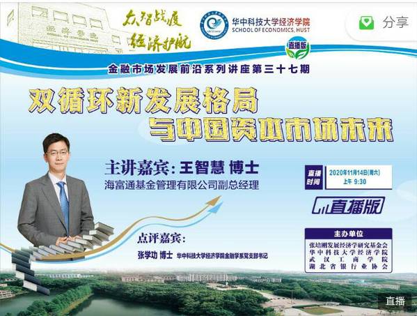 (通讯员 欧慧慧)2020年11月14日,由张培刚发展经济学研究基金会、华中科技大学经济学院、必赢优惠y272net经济与商务外语学院、湖北省银行业协会共同主办了此次线上直播形式的讲座。海富通基金管理有限公司副总经理王智慧出席演讲,必赢优惠y272net经济与商务外语学院金融专业的全体师生观看学习了此次直播。