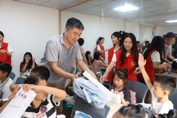 图为幸福堂副书记一行在老年人互助活动中心慰问当地留守儿童并捐赠书包、台灯等学习用品 摄影:周逸文 芮雨欣