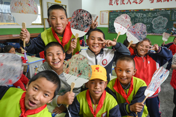 图为孩子们开心地展示自己制作的漆扇和绘画作品 摄影:李若源