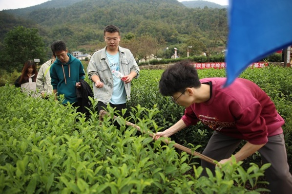 管理学院党总支书记王留志介绍,为了提升劳动教育的效果,学院积极创新劳动教育教学模式,丰富劳动育人教育阵地,与九畹溪镇石柱村圣天庄园建立劳动教育实践基地,让学生从理论课堂走向实践课堂,从校园走进茶园,跟着农民学习,从中体会劳动的艰辛、快乐和价值。