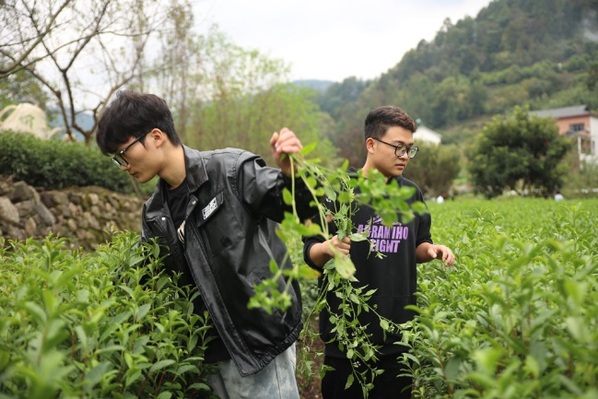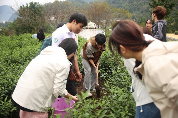 在劳动实践课上,吴光全和茶农们一边劳动,一边为大学生们讲解劳动要领,茶叶的生长环境、生长习性以及种植茶叶给当地村民带来的经济效益等。