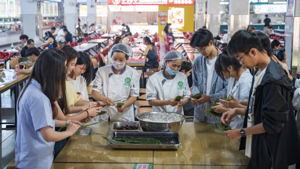 据学校后勤管理部副部长徐继安介绍,这已是学校连续第四年在端午节为在校师生送粽子了。“今年我们推出了板栗肉粽、蜜枣粽两种口味,满足了不同学生需求。与往年相比,今年还新增了包粽子体验环节,希望通过组织学生们参与传统美食制作,体验端午习俗,弘扬传统文化,也让远离家乡的学生们能够感受到‘武工商大家庭’的温暖。”