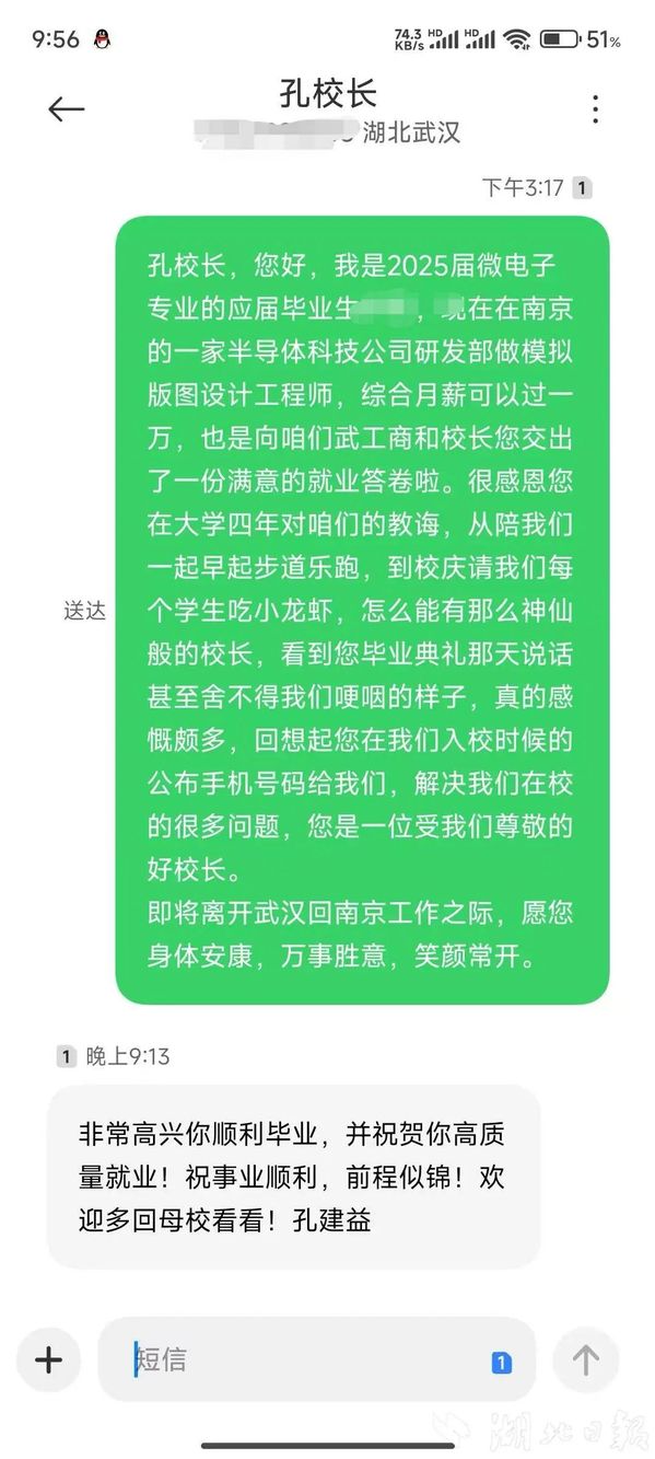 “开学典礼和毕业典礼是人生最美的遇见与离别。在你们开学典礼的遇见之际,我向同学们公布了手机号,当时就给大家承诺,我电话不一定能打得通,因为可能开会、上课等等,但是你只要发短信,我一定会回。这一点,我想大家这4年来也应该见证了。”