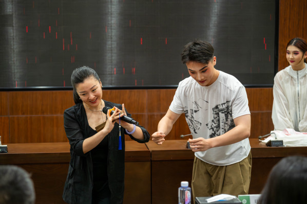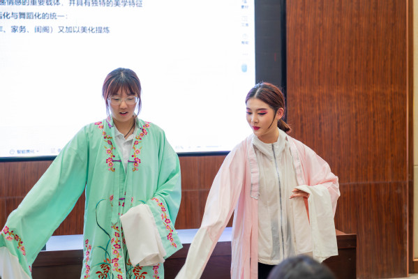 在探讨“她”力量的源泉与表达时,程丞强调,唱腔是传递女性情感力量的重要载体。黄梅戏唱腔总体风格优美流畅、委婉清新,且兼具口语化、生活化特点,感染力极强。她详细介绍了黄梅戏唱腔的核心板式与表演技巧,并特别指出,黄梅戏演员的眼神与表情是塑造角色的关键,需牢记“三微”原则:身体微侧、眼睛微睁、嘴角微笑。为让学员亲身体验,她邀请学员上台互动,6位学员身着水袖戏服,现场学习水袖花技法,并分为三组演绎黄梅戏经典“偶遇”片段,现场气氛十分热烈。
