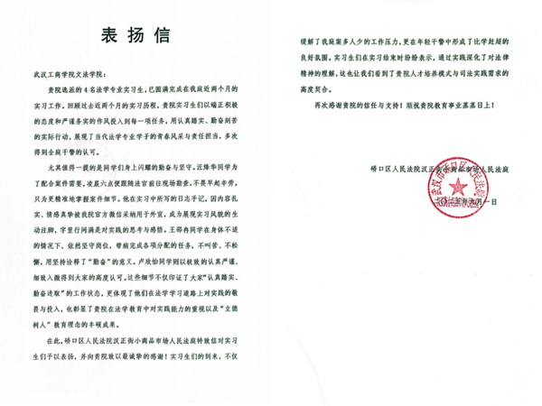 新闻中心讯(记者 雷雯珊)近日,武汉市硚口区人民法院汉正街小商品市场人民法庭向必赢优惠y272net文法学院发来表扬信,对该院4名法学专业实习生在实习期间的优异表现给予高度认可和诚挚感谢。