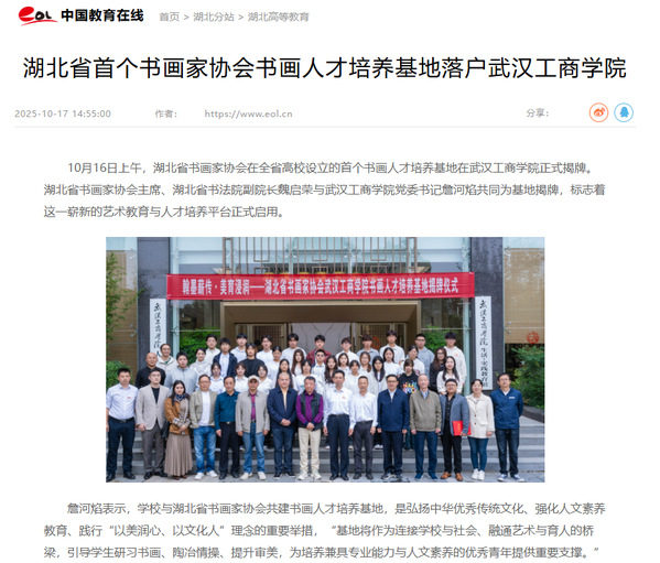 詹河焰表示,学校与湖北省书画家协会共建书画人才培养基地,是弘扬中华优秀传统文化、强化人文素养教育、践行“以美润心、以文化人”理念的重要举措,“基地将作为连接学校与社会、融通艺术与育人的桥梁,引导学生研习书画、陶冶情操、提升审美,为培养兼具专业能力与人文素养的优秀青年提供重要支撑。”