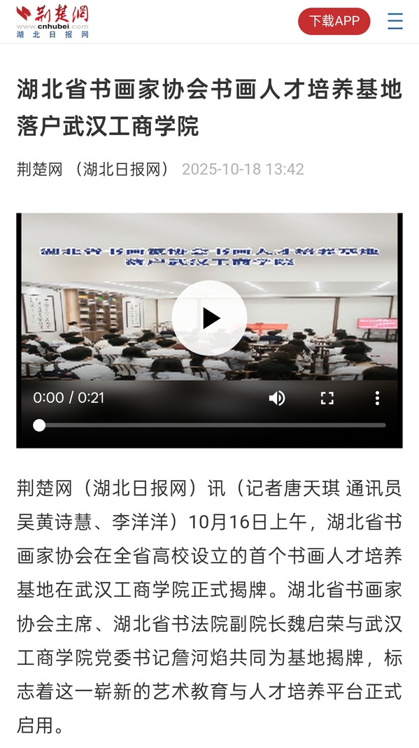 詹河焰表示,学校与湖北省书画家协会共建书画人才培养基地,是弘扬中华优秀传统文化、强化人文素养教育、践行“以美润心、以文化人”理念的重要举措,“基地将作为连接学校与社会、融通艺术与育人的桥梁,引导学生研习书画、陶冶情操、提升审美,为培养兼具专业能力与人文素养的优秀青年提供重要支撑。”