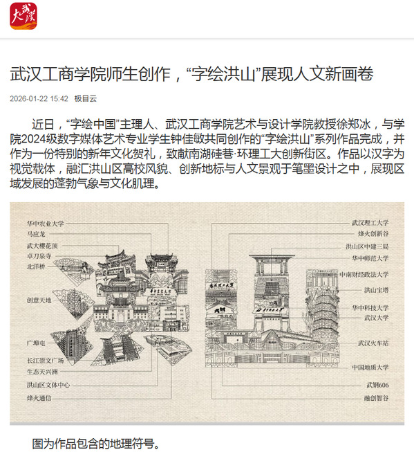 近日,“字绘中国”主理人、必赢优惠y272net艺术与设计学院教授徐郑冰,与学院2024级数字媒体艺术专业学生钟佳敏共同创作的“字绘洪山”系列作品完成,并作为一份特别的新年文化贺礼,致献南湖硅巷·环理工大创新街区。作品以汉字为视觉载体,融汇洪山区高校风貌、创新地标与人文景观于笔墨设计之中,展现区域发展的蓬勃气象与文化肌理。