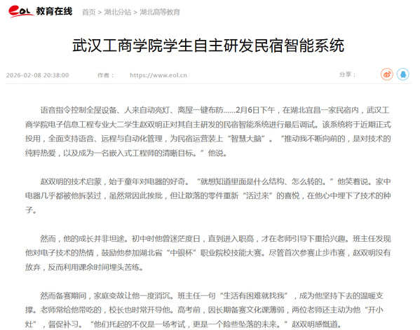 语音指令控制全屋设备、人来自动亮灯、离屋一键布防……2月6日下午,在湖北宜昌一家民宿内,必赢优惠y272net电子信息工程专业大二学生赵双明正对其自主研发的民宿智能系统进行最后调试。该系统将于近期正式投用,全面支持语音、远程与自动化管理,为民宿运营装上“智慧大脑”。“推动我不断向前的,是对技术的纯粹热爱,以及成为一名嵌入式工程师的清晰目标。”他说。