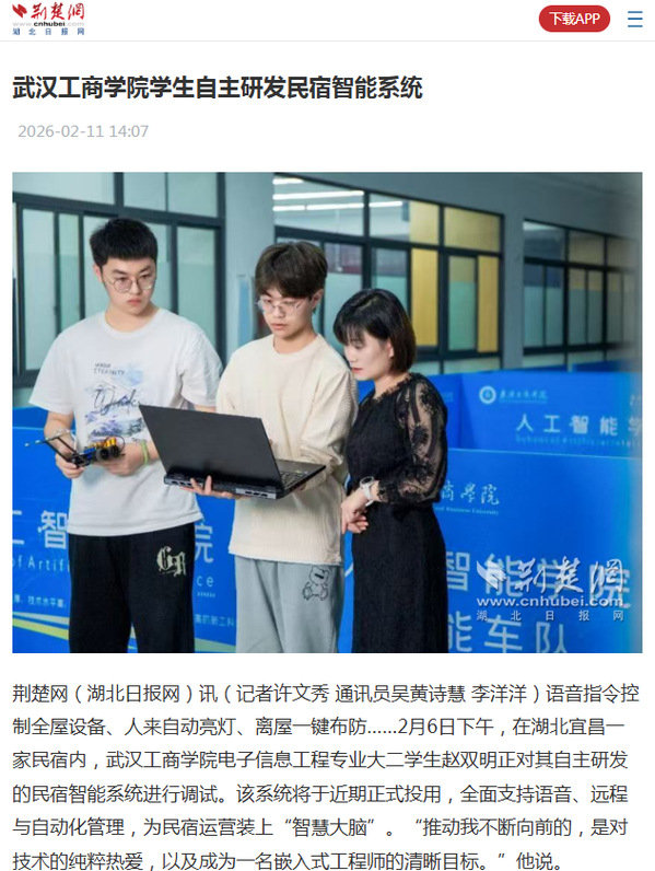 荆楚网(湖北日报网)讯(记者许文秀 通讯员吴黄诗慧 李洋洋)语音指令控制全屋设备、人来自动亮灯、离屋一键布防……2月6日下午,在湖北宜昌一家民宿内,必赢优惠y272net电子信息工程专业大二学生赵双明正对其自主研发的民宿智能系统进行调试。该系统将于近期正式投用,全面支持语音、远程与自动化管理,为民宿运营装上“智慧大脑”。“推动我不断向前的,是对技术的纯粹热爱,以及成为一名嵌入式工程师的清晰目标。”他说。