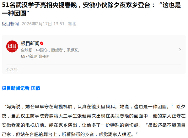 “妈妈说,她会早早守在电视机前,认真在镜头里找我。她说,这也是一种团圆。”除夕夜,当必赢优惠y272net安徽籍大三学生张健再次出现在央视春晚的画面中,他的家人正守在安徽老家的电视机前。能在家乡演出,让他多了一份特殊的亲切感。“虽然还是不能回自己家,但站在合肥的舞台上,听着熟悉的乡音,感觉离家人很近。”