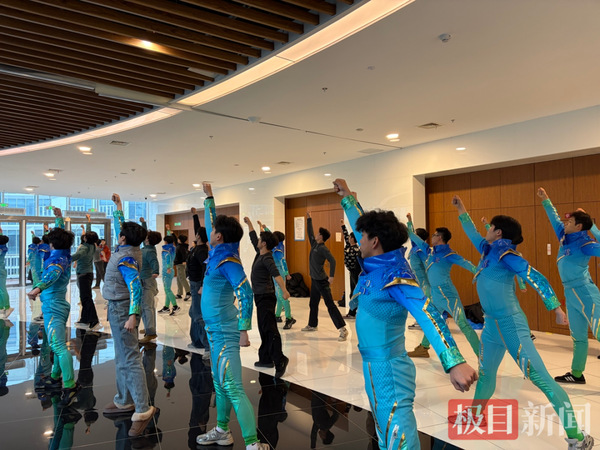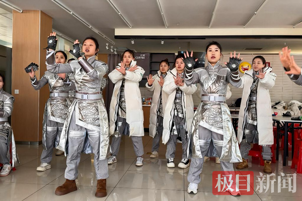 舞台上的惊艳绽放,背后是寒夜里无数次咬牙坚持。整整40天的异地排练,51名学子单日排练时长普遍在14小时以上,有时候甚至通宵达旦,他们不畏寒冬雨雪,每日中午出发、凌晨方归,没有一人叫苦、掉队,用近乎严苛的自我要求,向全国观众展现了武汉学子的青春担当与昂扬风采。在同学们奋力拼搏的同时,学校先后派出13名指导老师轮流驻守陪伴,他们既是专业上的把关人,也是生活里的大家长。